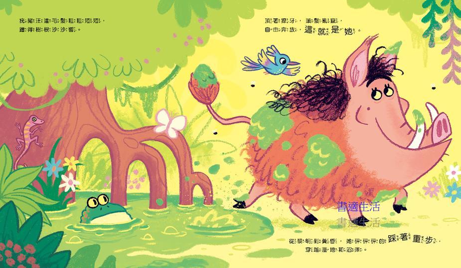 疣豬汪達喜歡在沼澤裡玩耍,她有著長長的獠牙、粗粗短短的毛髮,走起路來屁股搖搖擺擺,還結交了許多森林好朋友。