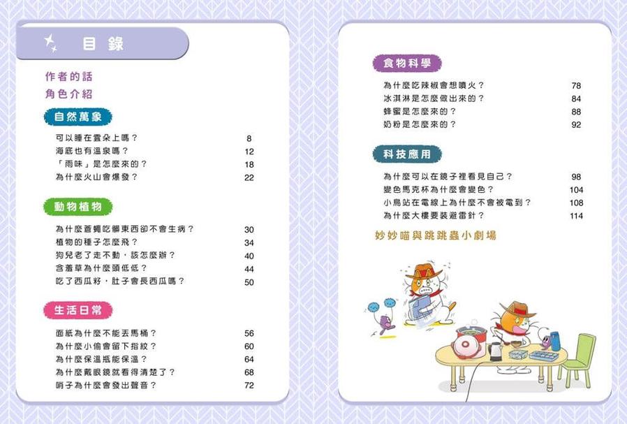 妙妙喵和跳跳蟲的漫畫故事,把真實生活情境搬進書裡,讓孩子忍不住想追問「為什麼?」