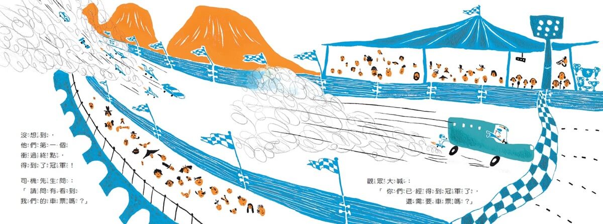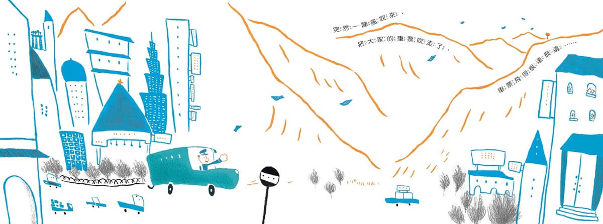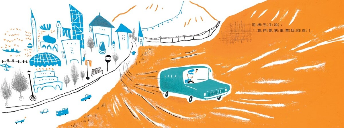 在這本橫掃國內外大獎的作品裡,繪本作家劉旭恭以橘色和藍色為主色調描繪,用帶有童趣的質樸筆觸勾勒,活潑的線條和大面積的色塊,表現出活力滿滿的氛圍。他獨特的幽默感,讓這個看似天馬行空的故事,多了一點哲思與溫度。司機先生為了追回被風吹走的車票,不管前方有多危險,即使受到勸阻、威脅、利誘等,也絲毫不受影響,堅持信念,一路往前追;雖然乘客不是主角,卻各有各的特色:老先生、上班族、帶菜籃車的太太、小學生、帶寶寶的公主……儘管身分不同,他們卻不分彼此,與司機先生一起翻山越嶺追車票。對了,別忘了在圖中找找小狗的身影,牠可是司機先生的好幫手喔!