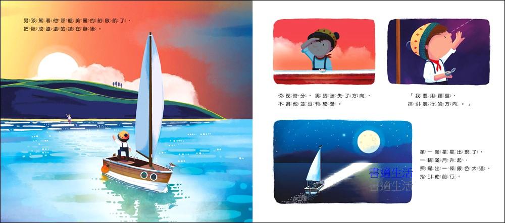 當夜幕降臨,他迷失了方向,但他沒有放棄——他知道指南針會指引他;當暴風雨襲擊小船,男孩相信他的小船會安然度過;晚上,他像他從小喜歡聽的故事中的老水手一樣,研究星星運行的軌跡。