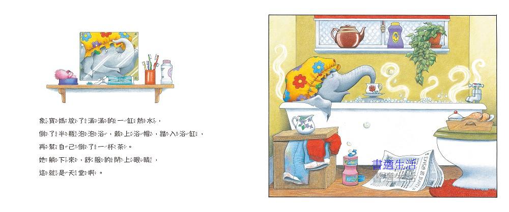 象寶媽決定泡壺茶、準備好點心,到浴室舒舒服服的個泡澡,放鬆一下。