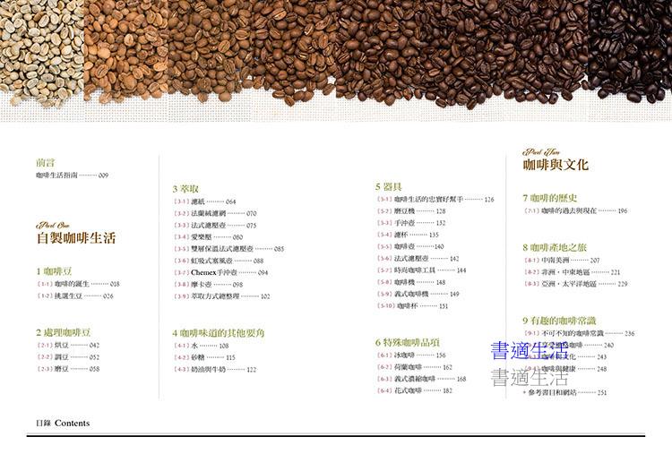 目錄: 前言:咖啡生活指南 Part 1:自製咖啡生活 1 咖啡豆 1-1 咖啡的誕生 1-2 挑選生豆 2 處理咖啡豆 2-1 烘豆 2-2 調豆 2-3 磨豆 3 萃取 3-1 濾紙 3-2 法蘭絨濾網 3-3 法式濾壓壺 3-4 愛樂壓 3-5 雙層保溫法式濾壓壺 3-6 虹吸式塞風壺 3-7 Chemex手沖壺 3-8 摩卡壺 3-9 萃取方式總整理 4 咖啡味道的其他要角 4-1 水 4-2 砂糖 4-3 奶油與牛奶 5 器具 5-1 咖啡生活的忠實好幫手 5-2 磨豆機 5-3 手沖壺 5-4 濾杯 5-5 咖啡壺 5-6 法式濾壓壺 5-7 時尚咖啡工具 5-8 咖啡機 5-9 義式咖啡機 5-10 咖啡杯 6 特殊咖啡品項 6-1 冰咖啡 6-2 荷蘭咖啡 6-3 義式濃縮咖啡 6-4 花式咖啡 Part 2:咖啡與文化 7 咖啡的歷史 7-1 咖啡的過去與現在 8 咖啡產地之旅 8-1 中南美洲 8-2 非洲‧中東地區 8-3 亞洲‧太平洋地區 9 有趣的咖啡常識 9-1 不可不知的咖啡常識 9-2 享受風格咖啡 9-3 咖啡與文化 9-4 咖啡與健康 參考書目和網站