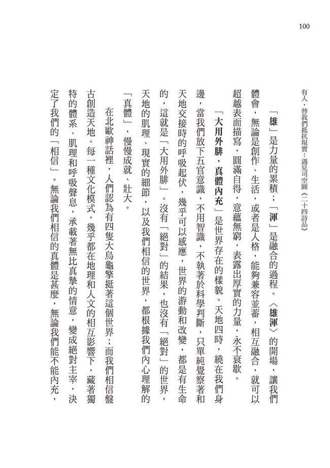 司空圖以一個人的努力,為戰亂流離的身不由己,抵抗現實;《二十四詩品》的多元探索,為疲憊厭倦的我們,抵抗現實。那些詩裡閃爍的精緻、故事中留下的回聲,以及在日常生活中偶然交錯的善意……,都曾替我們抵抗過現實。原來,真正的抵抗,不是推翻世界殘酷,而是守住心裡的一點溫熱,在不斷失去的縫隙裡,珍惜轉瞬。