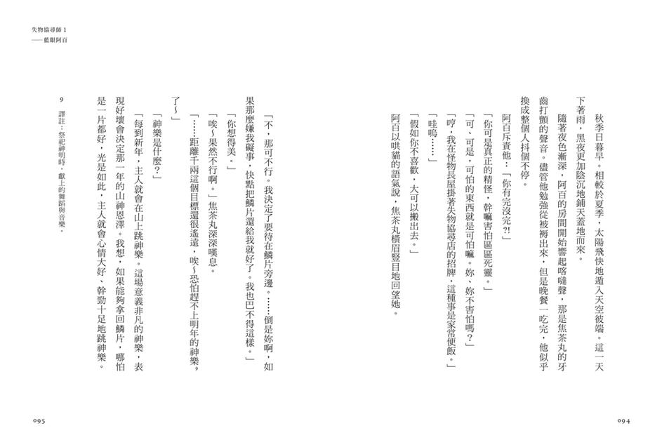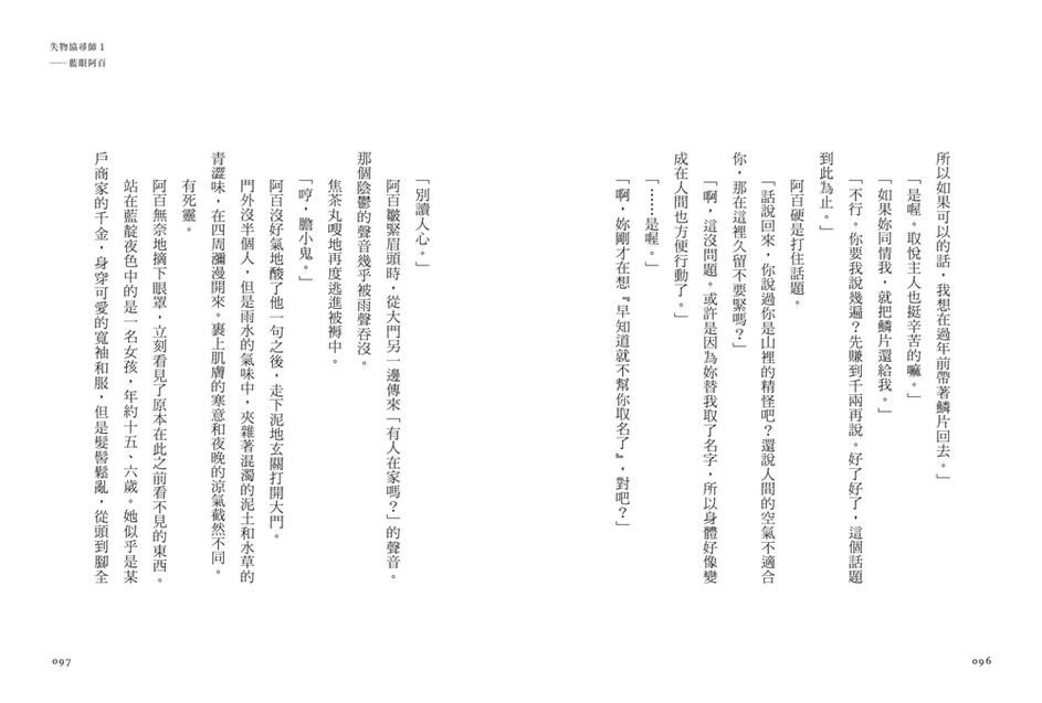 這隻天生的藍眼能讓她看見一般人看不到的「東西」,連親生父母都懼怕並厭惡她。不過,這種特殊能力,現在是阿百謀生的利器──專門接受委託尋找各種物品,有形的、無形的,而她的客人,也不全都是一般的「人」……