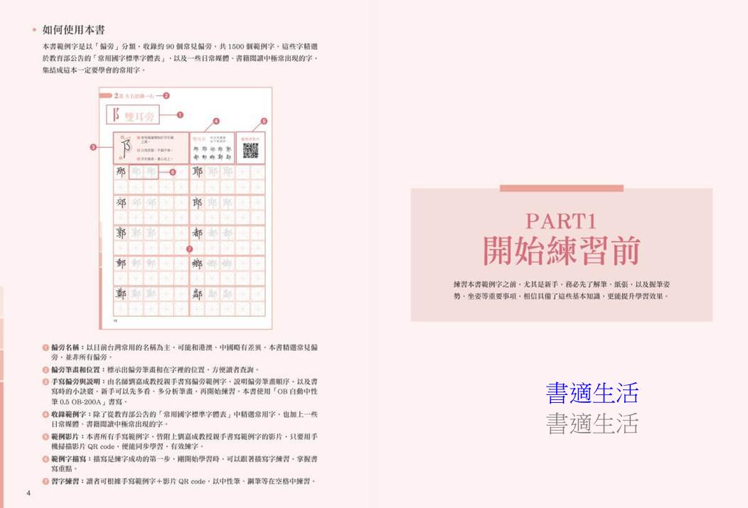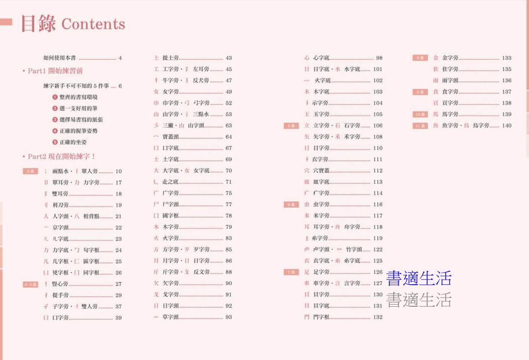 書中的例字是以「偏旁」為分類。什麼是偏旁?簡單來說,中文字除了獨體字之外,幾乎每個字都是由數個部件組成的合體字。以「松」字為例,是由「木」、「公」兩個部件組成,它的左偏旁是「木」字。有些偏旁因位置不同,例如「日」字,可分成「日字頭」:例字如早、星;「日字底」:例字如普、昏;「日偏旁」:例字如旺、明,書寫方式就會不同。