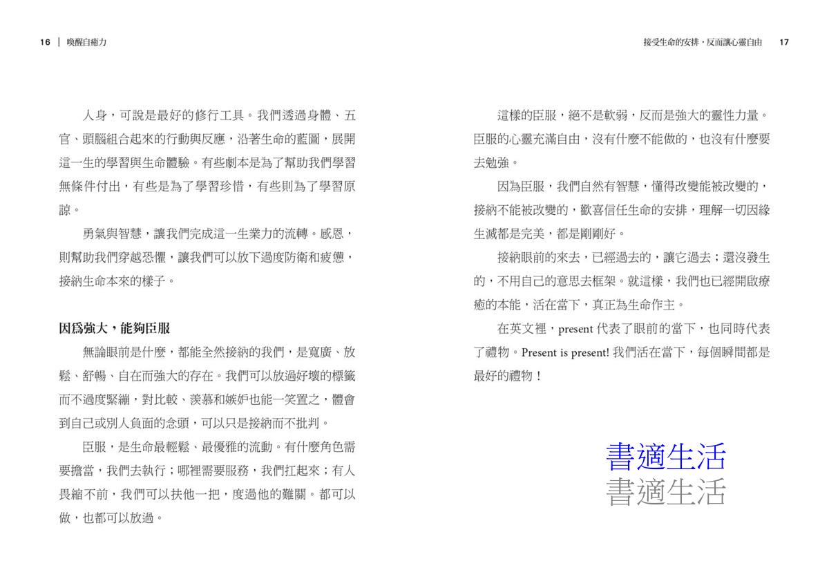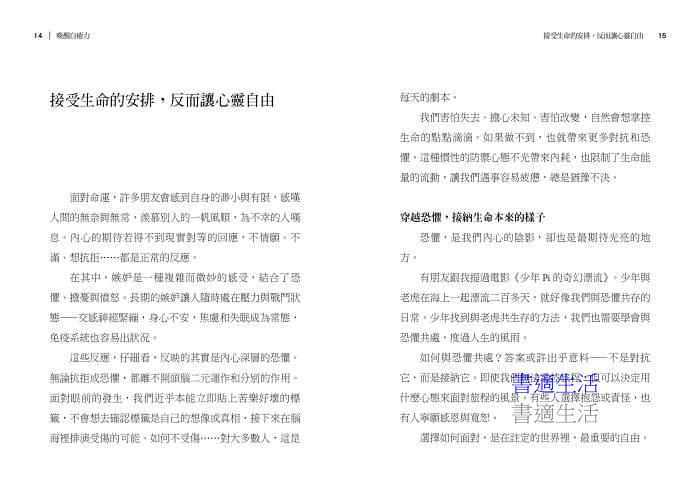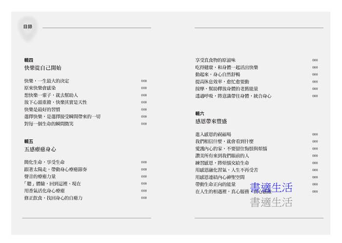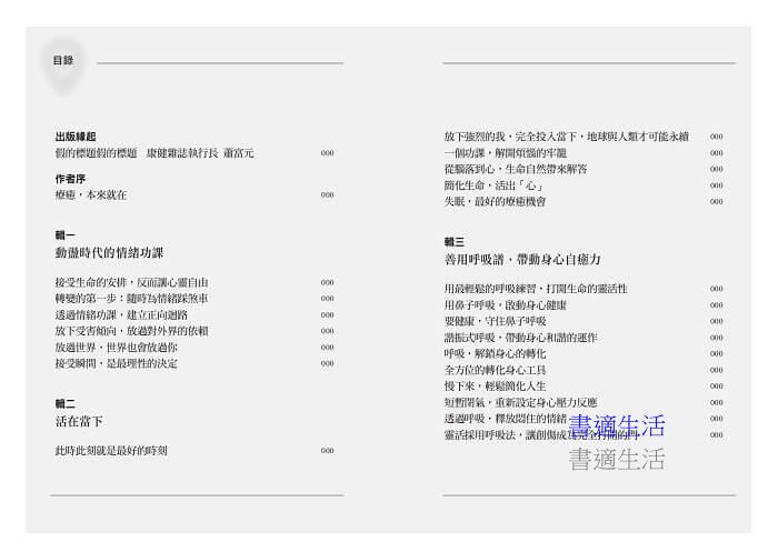 本書選輯的文章充分反映現代人的困境,也帶來解答──幫助讀者從接受現況開始,透過呼吸統合身心,在五官和頭腦的日常體驗,以感恩點點滴滴轉動心情,放過個人的侷限和痛苦,擁抱更廣大的生命觀點,活得圓滿,活得快樂。