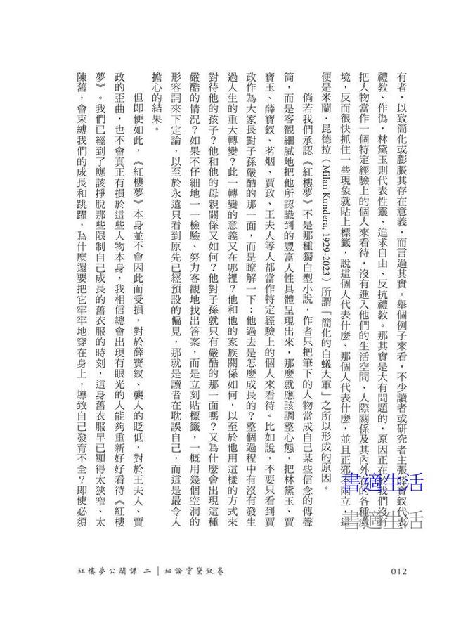 《紅樓夢公開課》第二冊專論紅樓「鼎足」三人:賈寶玉、林黛玉、薛寶釵的風采,細剖人物的立體面貌與心理複層,避免標籤化的平面解讀。全書借助「重像」概念,揭示角色的深層內涵與文化縱深,開展三人的性格底蘊與命運指向,並涉及寶黛釵的情感糾葛。透過貴族精神、雙性氣質與性別身分的探索,讀者不僅更理解紅樓人物的靈魂幽影,也在其中照見自我建構的諸多維度。