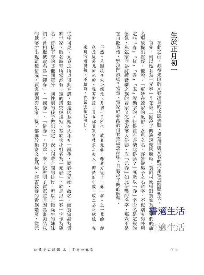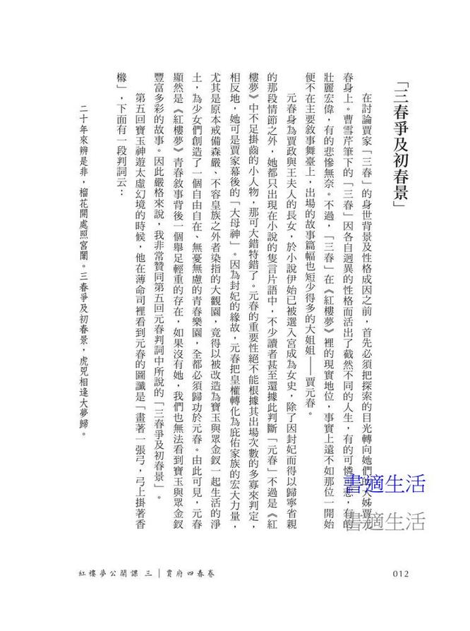 《紅樓夢公開課》第三冊以「賈府四春」:元春、迎春、探春、惜春的生命史為主線,解析她們迥異的性格與抉擇,疊映了貴宦家族與女性命運的無奈與掙扎。元春的宮廷悲劇、迎春的柔懦退縮、探春的理性恢宏與惜春的孤絕棄世,各自成為紅樓盛衰的一片圖景,由此得以察見女性在血緣、權力與情感夾縫中的奮鬥與超越,也更完整理解紅樓宇宙的深邃。