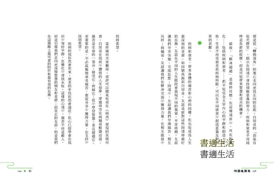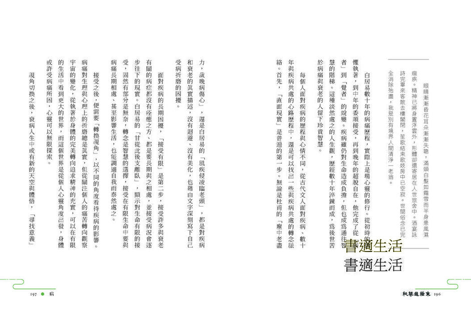 白居易對疾病做了真實的描述,不刻意美化。但他的轉念智慧令人敬佩,既然身體已經支離破碎,那就甘心接受臥床的現實;慶幸的是,過去還有過自由自在的美好時光。從抗拒到接受、從痛苦到感恩的心境轉換著實不易。