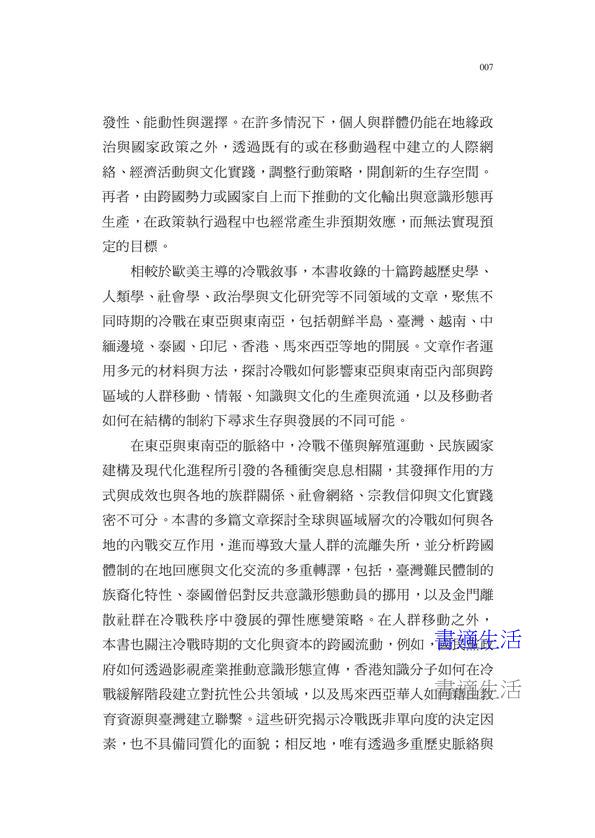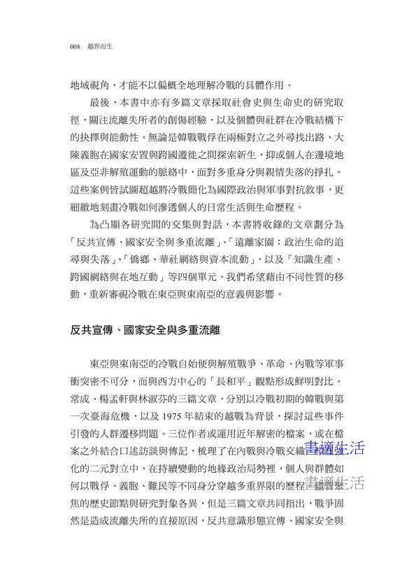 《越界而生》以東亞與東南亞為核心,收錄10篇跨越歷史學、政治學、人類學、社會學與文化研究的文章,重新檢視冷戰如何影響區域內外的人群遷徙、情報運作、知識生產與文化流動。從朝鮮半島、臺灣、越南、中緬邊境,到印尼、香港與馬來西亞,作者們聚焦那些被捲入地緣政治、卻又試圖在夾縫中尋找出路的個體與社群。