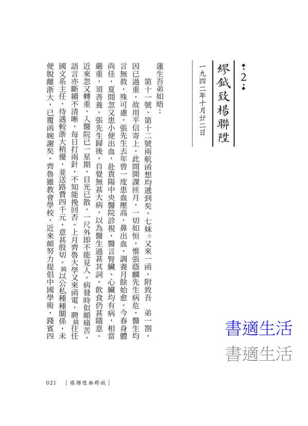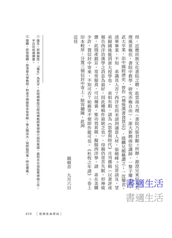 楊聯陞在哈佛講壇上持批評之銳,亦在信中流露敬長之禮、治學之誠。他與繆鉞論及文史教學與時代風潮,與錢穆則深入研討《朱子新學案》、儒學義理及學術出版。信中語氣或懇切,或沉靜,然皆蘊含一種不捨文化精神凋敝的溫熱。這些信劄並不為宏論歷史所設,卻無意間為當代留下珍貴的學術側影。見證了三位知識分子對於「思想可以如何活著」的實踐――不靠宏大的制度,而靠紙筆間的持續質問與回應。本書信件來自家屬珍藏以及素書樓基金會等首度公開資料,是形成現代學術發展的重要印記。