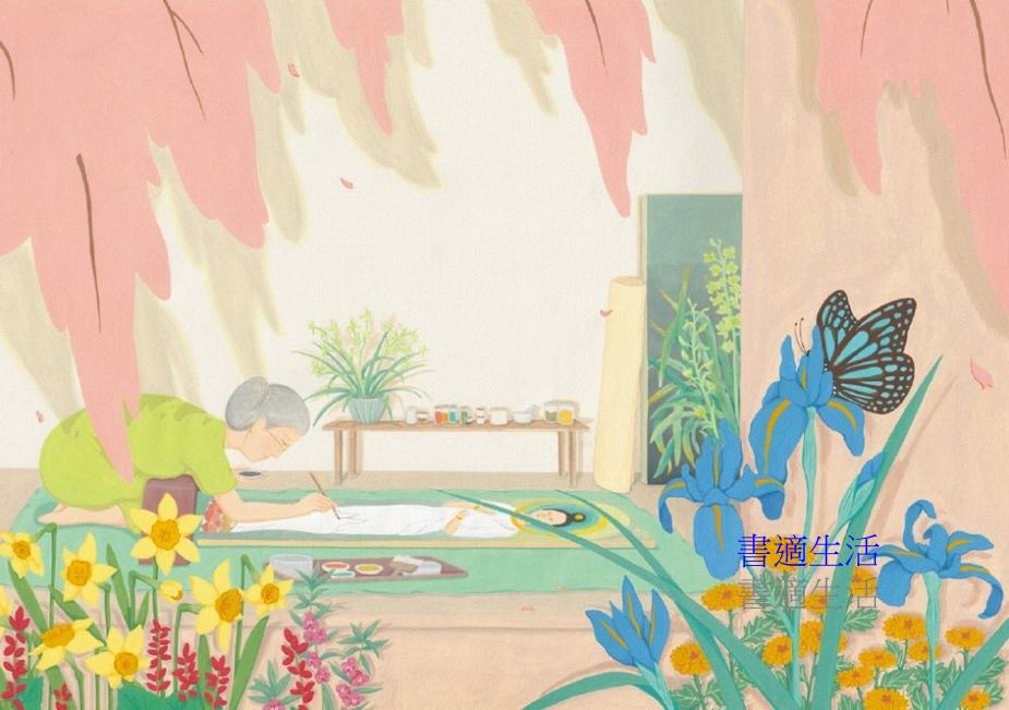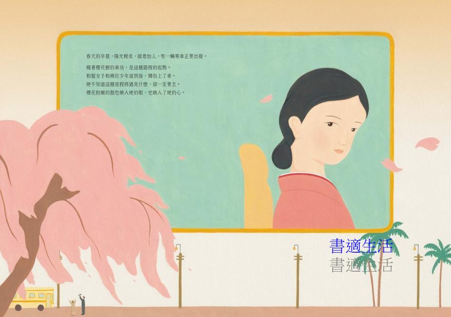 櫻花盛開的春晨,一輛車緩緩駛向山頂的畫室……沿途的山川與花木象徵時光的流轉,而車廂內的女子們談笑、回憶,在重重花影間訴說著與陳進相遇、學畫、成長的點滴。全書勾勒出畫家對藝術的堅持、筆下人物對創作者的深情,以及女性在時代浪潮中永不退縮的勇氣與光彩。