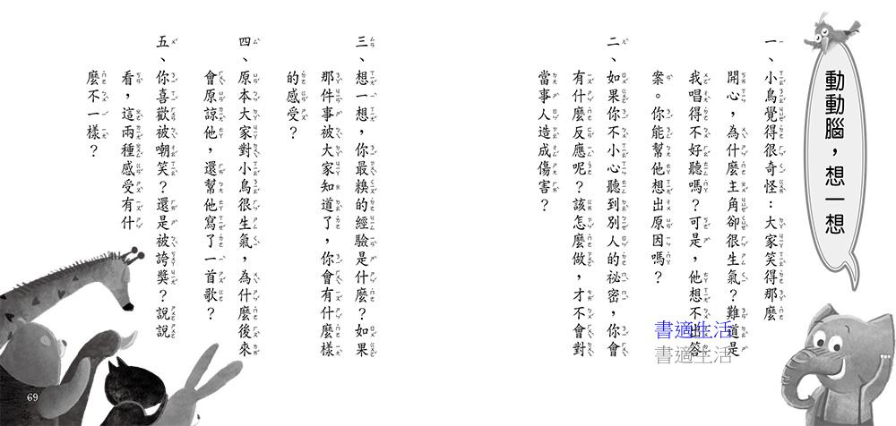 小鳥很喜歡唱歌,走到哪兒唱到哪兒。他的歌聲美妙動人,歌詞幽默風趣,只要聽完他的歌,一整個禮拜都會有好心情。可是某一天,小鳥居然把偷聽到的祕密編成歌曲,唱給大家聽!從此,大家都等著聽別人的八卦,看別人的笑話,同學之間互相嘲笑、猜忌,再也不敢分享心事。幸好小鳥即時發現自己的錯誤,下定決心改變,不再道人長短,而是用心觀察大家的優點,為同學寫下滿滿的讚美之歌,變成一隻人見人愛,專說好話的小鳥!