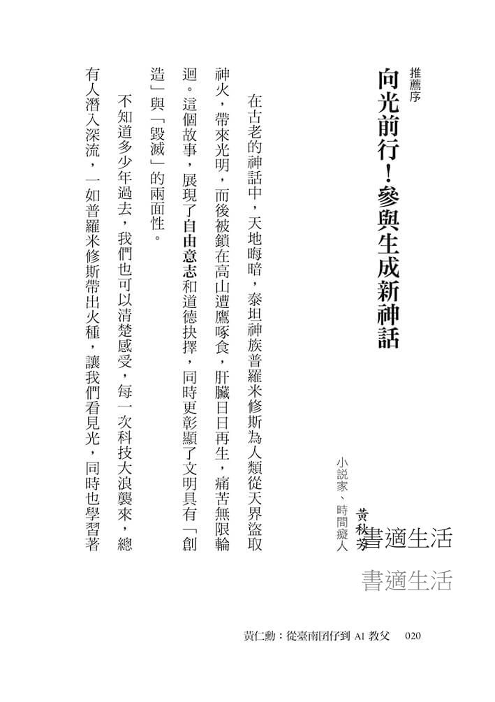 黃仁勳一生的故事如熔爐,從「成長與奮鬥的DNA」孵化與突破,走過AI創業的艱辛之路,撼動產業,以獨特的信念與韌性,織就出自己的「成功學」。卷末的「金句分享」,將「逆境」、「夢想」與「科技」的火焰,鍛鑄未來的指南針,適合在課間討論或用於團體共讀;放在案頭當作「預言之書」,反覆翻閱,有啟示,也有趣味,像仰望夜空星圖,從火而來,向光前行。