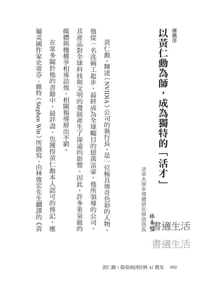 一、獻給新世代的影響台灣經典人物傳記:《黃仁勳:從臺南囝仔到AI教父》,本書作者以生物成長的循環模式講述與解讀黃仁勳不同的生命階段,同時也點出許多他的「成功因子」,希望藉由此書能讓讀者找到自己的成功因子,並創造出專屬自己的生命價值。