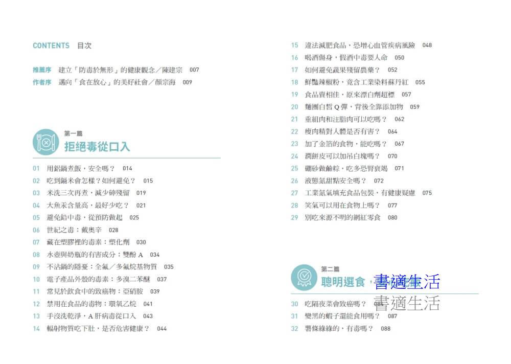 網路資訊既多又雜,有時總是真假難辨。每次看到似是而非的健康資訊在親友間到處轉傳,都讓我非常憂心。本書由顏宗海醫師親自彙整,從毒化物、食品添加物,到食物的保存與中毒防治,最後延伸至環境安全及腎臟保健等,旨在幫助大家建立正確的防毒及食安觀念,過上健康安心的好生活,這也是我一直以來的期盼。