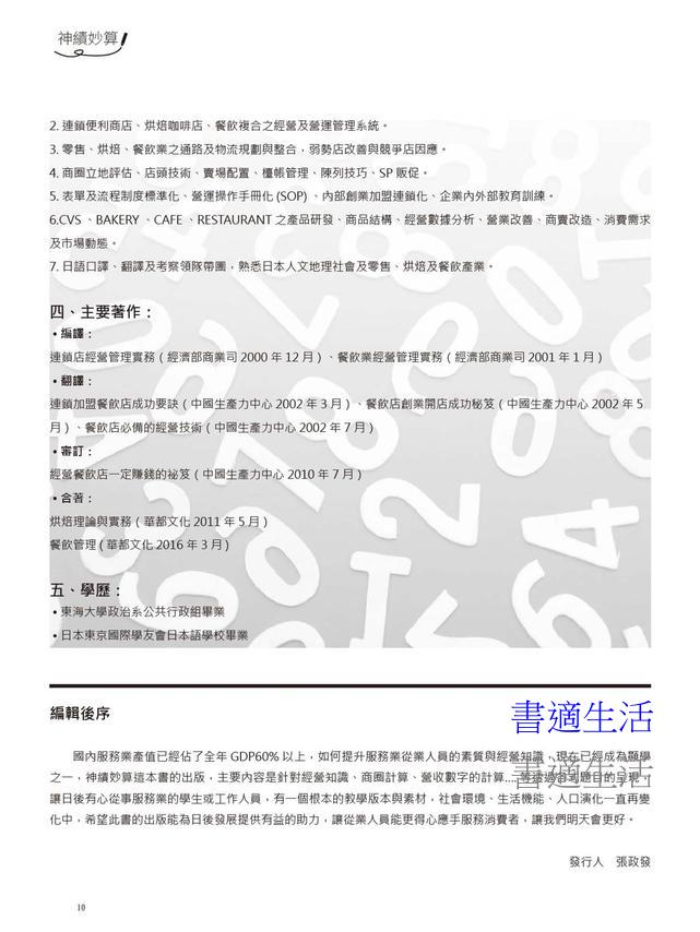 神績妙算這本書的出版,主要內容是針對經營知識、商圈計算、營收數字等計算,透過各式題目的呈現,讓有心從事服務業的學生或工作人員,有一個根本的教學版本與素材。
