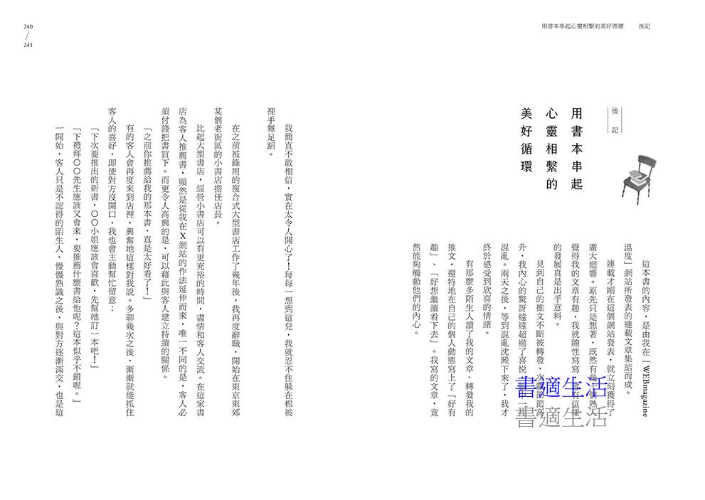 從啟程時的跌跌撞撞,到後來的漸漸著迷、得心應手,菜菜子更深刻體會到,「推薦書」這件事,並不是只要根據深度、有趣、實用這些標準,它更涉及了你對對方的理解和心意相通,每一本認真思量後推薦的書,就宛如她為對方調製的療心配方。
