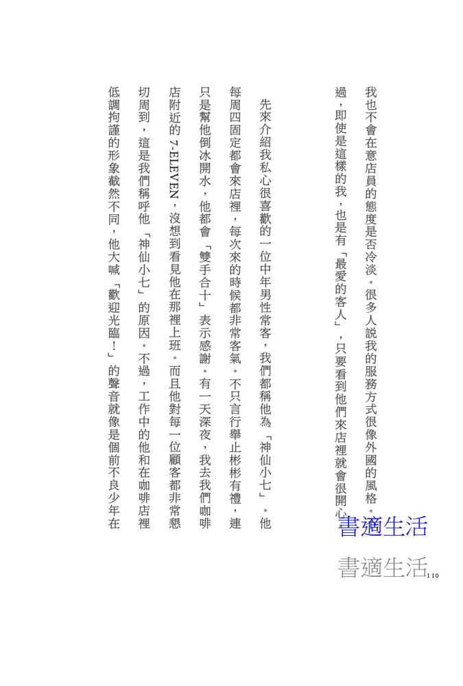 「在人生陷入最低潮時,我開始在這家咖啡店工作,這裡的一切徹底顛覆了我過去所有的常識和價值觀。上班時間可以隨意聊天,髮型、髮色隨店員高興,與顧客的互動方式也很自由;還可以跟客人吵架,甚至可以禁止客人光顧。坦然面對自己的感受,讓我終於能夠肯定自己,或許我一直都很想說出『請不要再來了』這句話。遇到客人說『我是客人欸』、『你是店員還這樣』時,我也能回嗆他『店員也是人啊』。店員也是有感情的。我們和大家一樣都是人,也都是對某人而言重要的人。」