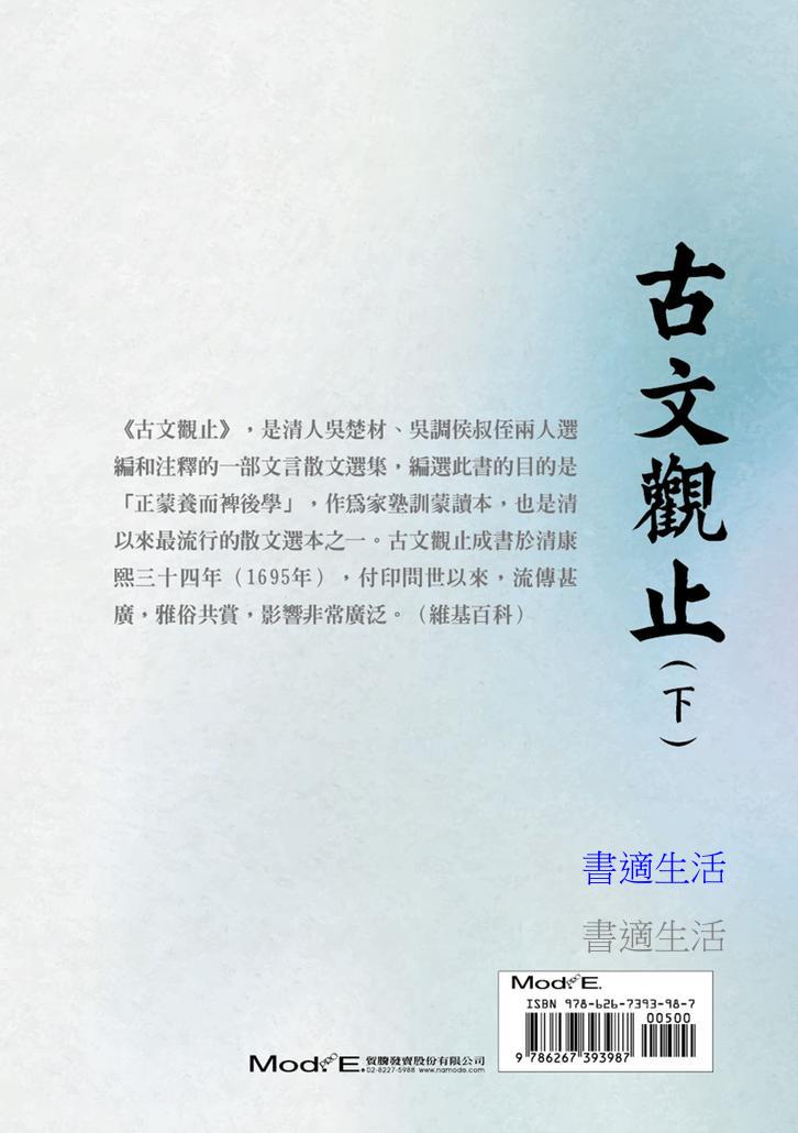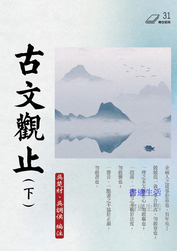 《古文觀止》,是清人吳楚材、吳調侯叔侄兩人選編和注釋的一部文言散文選集,編選此書的目的是「正蒙養而裨後學」,作為家塾訓蒙讀本,也是清以來最流行的散文選本之一。古文觀止成書於清康熙三十四年(1695年),付印問世以來,流傳甚廣,雅俗共賞,影響非常廣泛。書中選編了上起東周、下至明代的二百二十二篇散文作品,其中絕大多數為古文,個別為散文中的經典作品,作品題材涉及史傳、策論、遊記、書信、筆記等,所錄者,以左傳、國語、戰國策、禮記及史記之文較多;兩漢詔策書表點綴其間;而以唐宋八大家之文為主,佔三分之一強;明文續其末,均為古籍中精華及名家之代表作。(維基百科)
