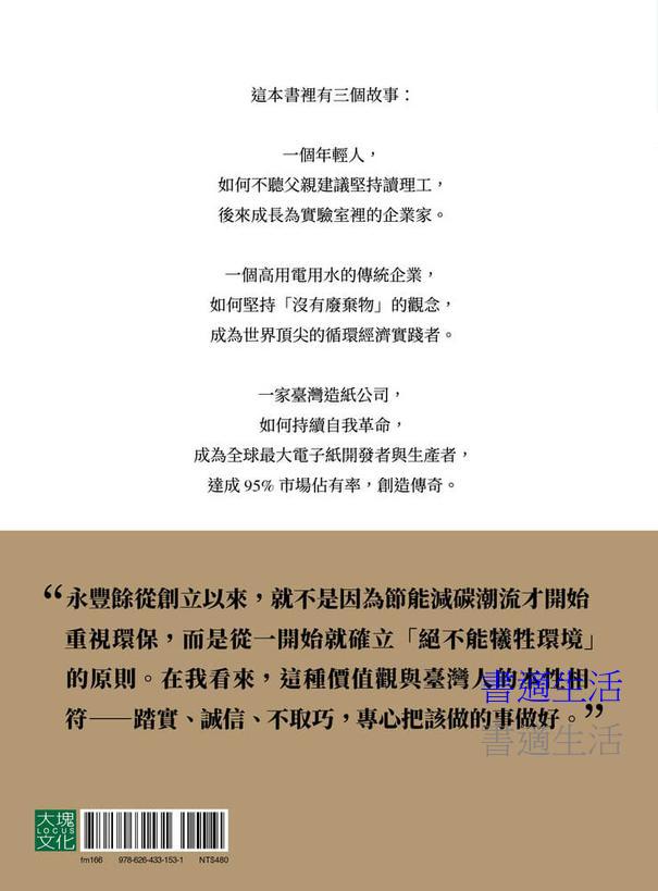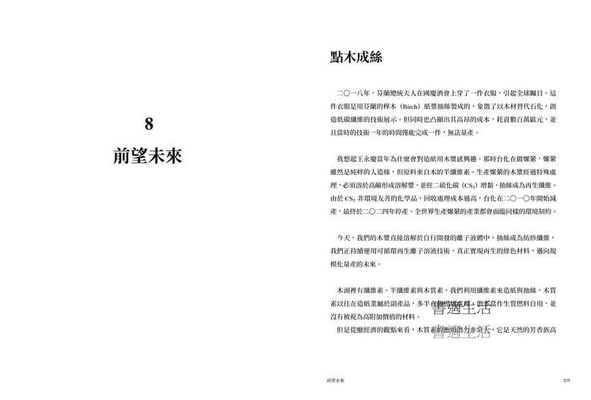 書中記載了他如何以「實驗精神」開疆拓土——從親手設計抄紙機台到預見電子紙未來的精準嗅覺,並將關愛土地的情懷,化為建立全循環產能的堅持。他也因而發展出「醣經濟」理論。