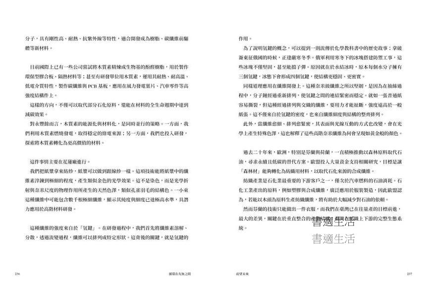 最後,本書最後還有一章「前望未來」,透過何壽川個人和永豐餘正在研發的最尖端科技視野,展望人類生活,從衣著、住屋、交通工具的各種新變化的可能,以及臺灣企業可以如何在連結草根中,參與這些新的機會。