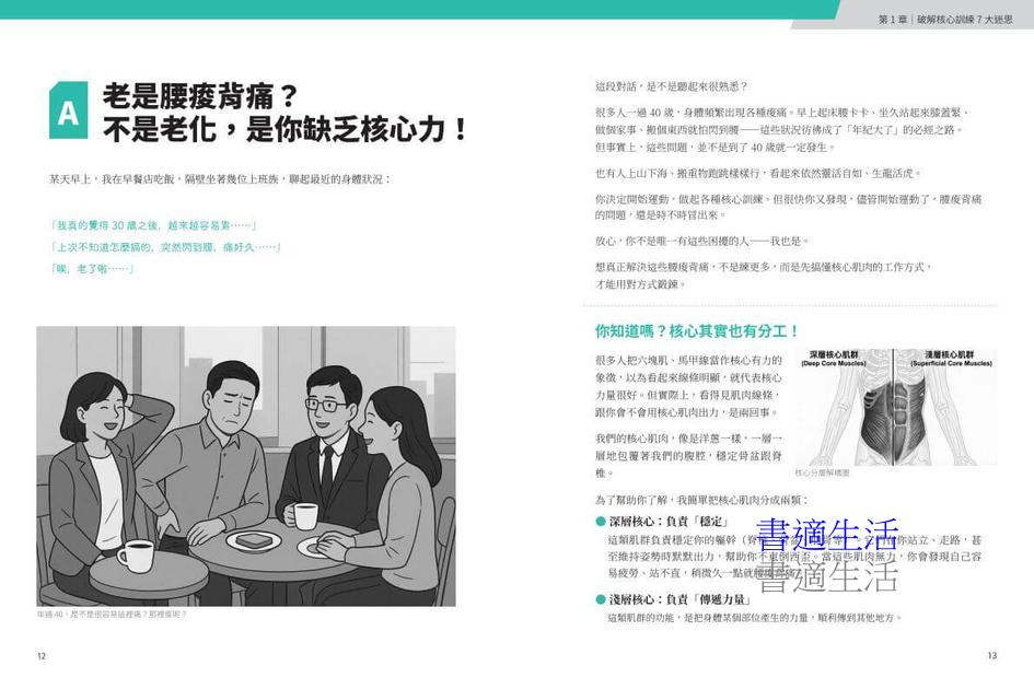 本書從深層核心與淺層核心的協調出發,指出多數人腰痠背痛、反覆受傷的真正原因,不是練得不夠,而是深層核心沒有先被喚醒。書中引導讀者從「穩定」開始,循序建立核心力量,打造一套貼近中年身體、能長久實行的核心訓練方式。