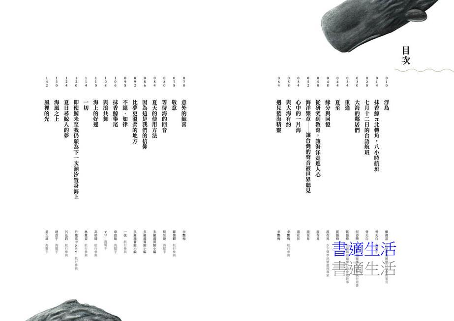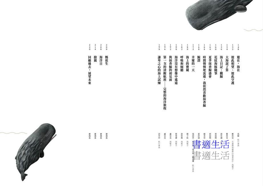 浮島(花蓮縣福爾摩沙協會理事長 廖鴻基)/抹香鯨π北轉角,八小時航班(海幫手 曾天白)/七月十二日的台語航班(曾天白)/大海的鄰居們(花蓮縣福爾摩沙協會執行祕書 何姿樂)/重逢(花蓮縣福爾摩沙協會總幹事 藍振峰)/夏至(藍振峰)/緣分與回憶(水下聲學訊號處理專家 溫在昇)/從研究到教育,讓海洋走進人心(溫在昇)/海洋樂章──讓台灣的聲音被世界聽見(溫在昇)/心中的一片海(溫在昇)/與大海有約(航行參與 李艷梅)/遇見藍海精靈(李艷梅)/意外的鯨喜(李艷梅)/敬意(航行參與 羅俊驛)/等待海的回音(海幫手 蔡昱婕)/夏天的使用方法(多羅滿賞鯨小編)/因為這是我們的信仰(多羅滿賞鯨小編)/比夢更溫柔的地方(多羅滿賞鯨小編)/不絕.如律(航行參與 一弦)/抹香鯨舉尾(海幫手 章庭瑜)/與浪共舞(海幫手 YU)/海上的好運(航行參與 高郁晴)/一切(航行參與 林蕙姿)/即使鯨未至我仍願為下一次潮汐置身海上(航行參與 丹鳳高中Zen Yi)/夏日尋鯨人的夢(航行參與 呂弘鈞)/海風之上(海幫手 趙浩宇)/風裡的光(海幫手 姜正雄)/還在,海在 (航行參與 孤鯨)/彼此相望、彼此守護(花蓮縣福爾摩沙協會設計、海幫手 鄭欣宜)/大海說了算(鄭欣宜)/海上日記:觀鯨(海幫手 薛佳融)/花紋海豚隨筆(海幫手 郭庭榕)/夏季抹香鯨盛會(郭庭榕)/時間悄悄的流逝,我依然喜歡抹香鯨(航行參與 賴美容)/鯨漂(航行參與 黃詩涵)/幸運的一天(航行參與 張曲祥、張羿嵐、張丞榜、顧晨耀)/海上的寶藏(海幫手 陳子紘)/呼吸和傾聽(海幫手 游原煥)/海洋沒有想像中遙遠(海幫手 蔡雯潔)/與抹香鯨的初見面(海幫手 盧宜良)/第一次的清醒航班──完整的海洋旅程(盧宜良)/謙卑之心的海上試煉(航行參與 邱芳玲)/媽祖生(廖鴻基)/海洋日(廖鴻基)/搶親(廖鴻基)/回顧過去,展望未來(廖鴻基)