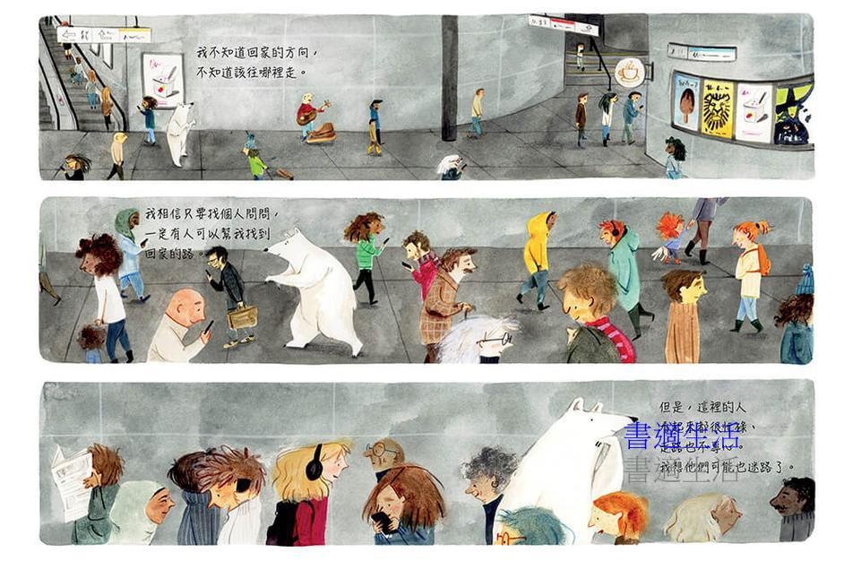 一波三折後,熊在地鐵上遇見了一個好心的小女孩帶他回家,小女孩幫熊洗澡、給他飯吃,還陪他一起念書,最後還幫熊找到回家的方法……在這整個過程中,似乎只有小女孩看到了熊,連小女孩的媽媽也是一路滑手機,甚至不知道女兒帶了一隻熊回家呢!媽媽的反應,代表的也是大部分人類的反應。而,看見熊的困境的小女孩,也就是少數對保護環境議題有所覺醒的人吧!