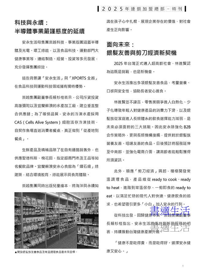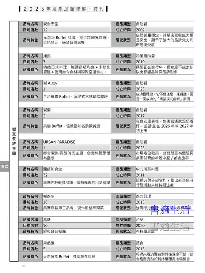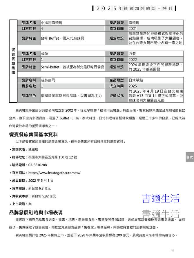 報導台灣主要連鎖加盟的脈動,包含全台各地主流連鎖業態之店數、資本額、國外分佈、營業規模及最新營運狀況。邀集各業態傑出營運負責人,分析經營戰略。對全台的服務業、零售業、餐飲業連鎖店動態進行整理,更收錄了重點業態、企業簡介、店數統計、總部資訊以及門市資訊,使讀者能夠明確掌握台灣各產業之現狀。