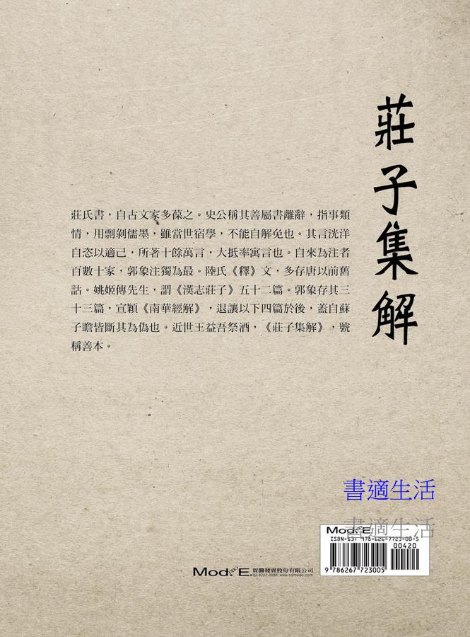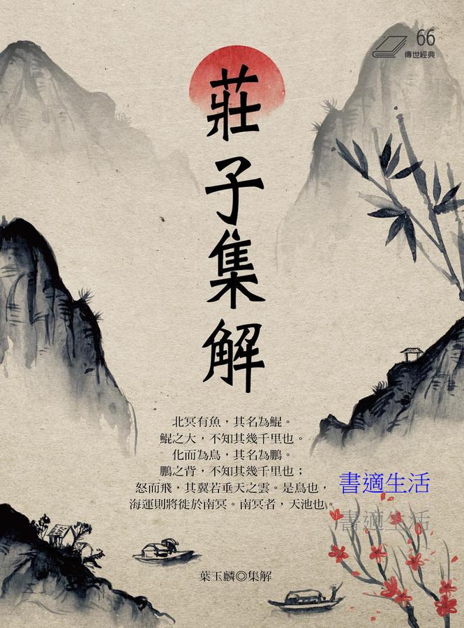 莊氏書,自古文家多葆之。史公稱其善屬書離辭,指事類情,用剽剝儒墨,雖當世宿學,不能自解免也。其言洸洋自恣以適己,所著十餘萬言,大抵率寓言也。自來為注者百數十家,郭象注獨為最。陸氏《釋》文,多存唐以前舊詁。姚姬傳先生,謂《漢志莊子》五十二篇。郭象存其三十三篇,宣穎《南華經解》,退讓以下四篇於後,蓋自蘇子瞻皆斷其為偽也。近世王益吾祭酒,《莊子集解》,號稱善本。本書分〈內篇〉、〈外篇〉、〈雜篇〉三部分,收逍遙遊、齊物論、養生主、人間世、德充符、馬蹄、刻意、繕性、秋水、至樂、山木、外物、寓言、說劍、漁父等文章,每篇配有譯文。