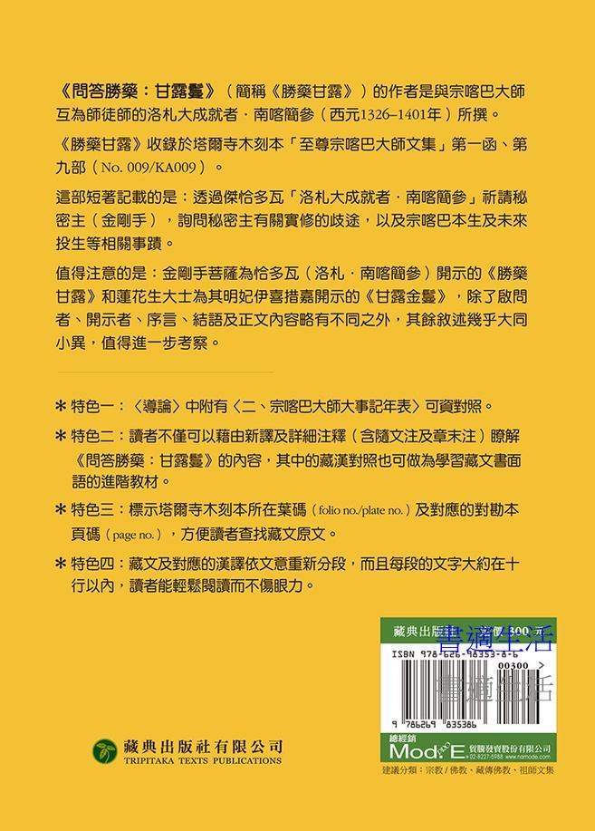 ✻特色二:讀者不僅可以藉由新譯及詳細注釋(含隨文注及章末注)瞭解《勝藥甘露》的內容,其中的藏漢對照也可做為學習藏文書面語的進階教材。