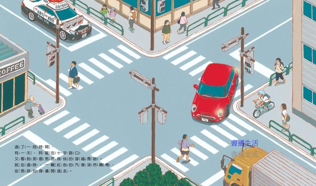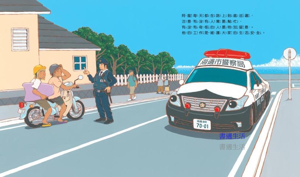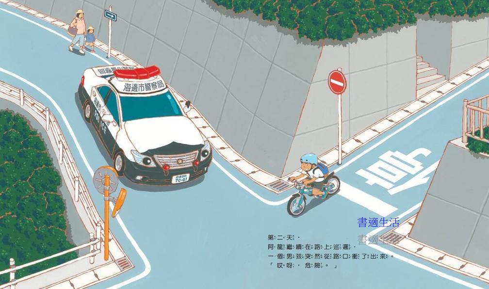 有一天,阿龍在巡邏時,遇到一位小朋友騎著踏車在路上橫衝撞,