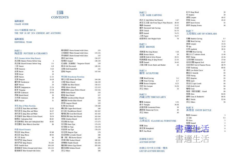 本刊大量搜集並精選呈現蘇富比、佳士得、邦瀚斯、中國嘉德、中國嘉德(香港)、中貿聖佳、聖佳香港、北京保利、保利廈門、保利香港、永樂拍賣、西泠印社、古天一、榮寶、誠軒、華藝國際(廣州)、明軒、朵雲軒、十竹齋拍賣(北京)、南京十竹齋、鴻盛祥、中漢、大羿、羿趣、匡時、龍裔玉冰、上海仲軒、北京博美、東京中央、上氏拍賣、東京飛鳥、橫濱國拍、大美會、京騰龍、帝圖、允臧齋、闊樂、納高、倫佩茨、威立士、艾德、朵爾拍賣、古龍會、宇珍、江蘇觀宇、惜魚、Aguttes、Aponem、Bukowskis、Cambi、Dreweatts、Dixon's Crumpton Auction、Roseberys、Tessier-Sarrou等拍賣公司,自2024年1月1日至12月31日的中國骨董文物拍賣交易紀錄,共2500多筆,530餘頁,中英對照,並附圖片說明,是目前藝術市場上唯一可參考的拍賣年鑑。