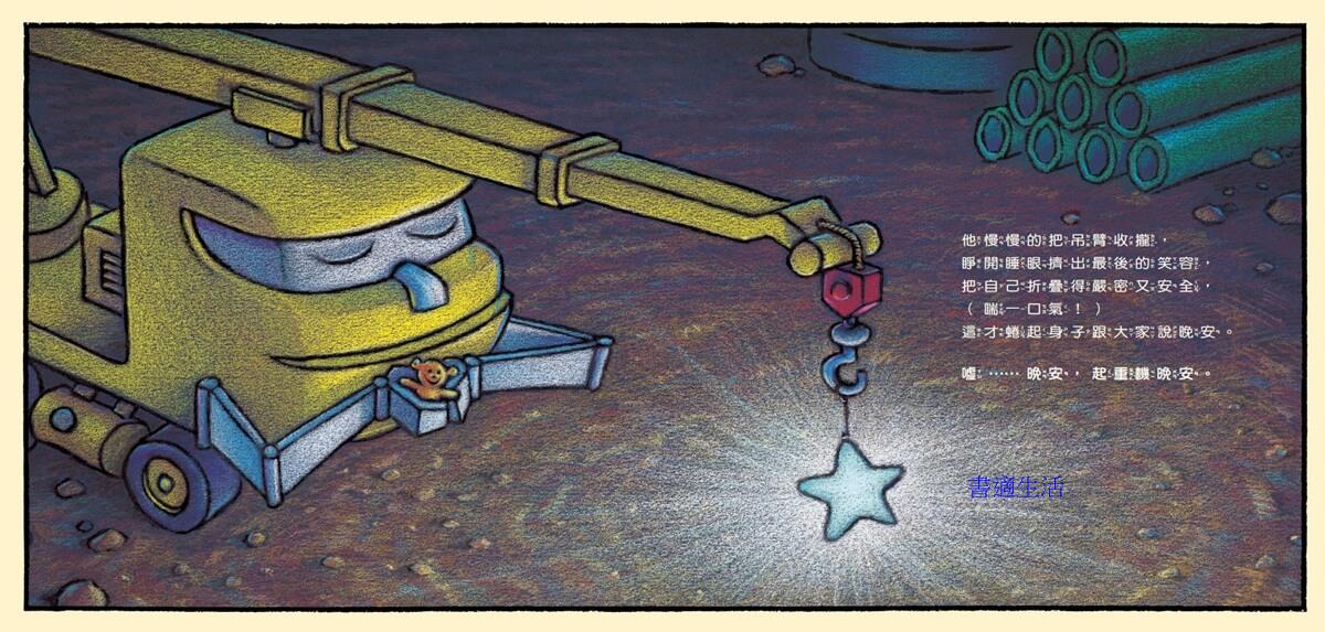 太陽下山了,天色愈來愈暗,該是說晚安的時候,就連強壯的工程車也不能再玩。起重機、混凝土拌合車、傾卸卡車、推土機、挖土機,一個接一個結束了工作,洗好澡,關掉引擎、燈光,準備上床去睡覺!