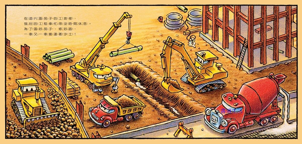 跟著神氣的工程車,一起體會白天努力工作、晚上好好休息的生活!