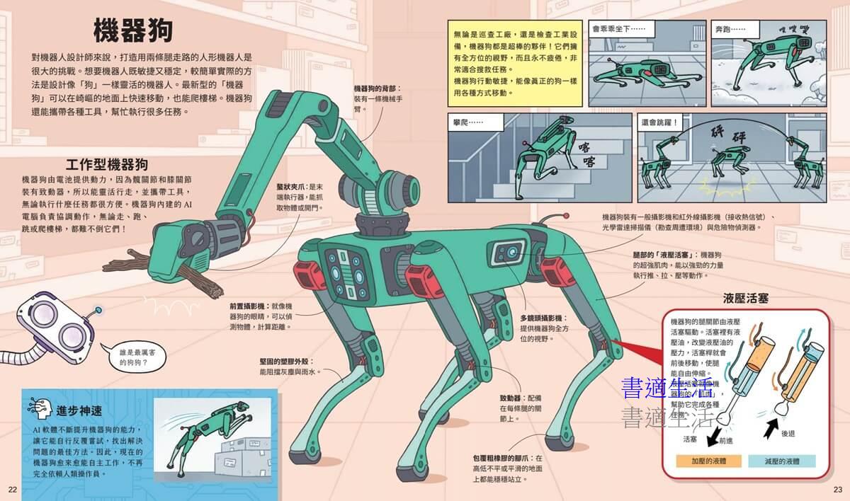 內容介紹超過25種機器人類型:精準運作的工業機器人、深入火災現場的消防機器人、探索火星的漫遊機器人、修復海底設備的水下機器人,以及醫療現場的機械手臂、突破人體極限的動力服,就連日常生活中常見的掃地機器人、智慧家庭系統與自動駕駛車都一一詳盡解析。