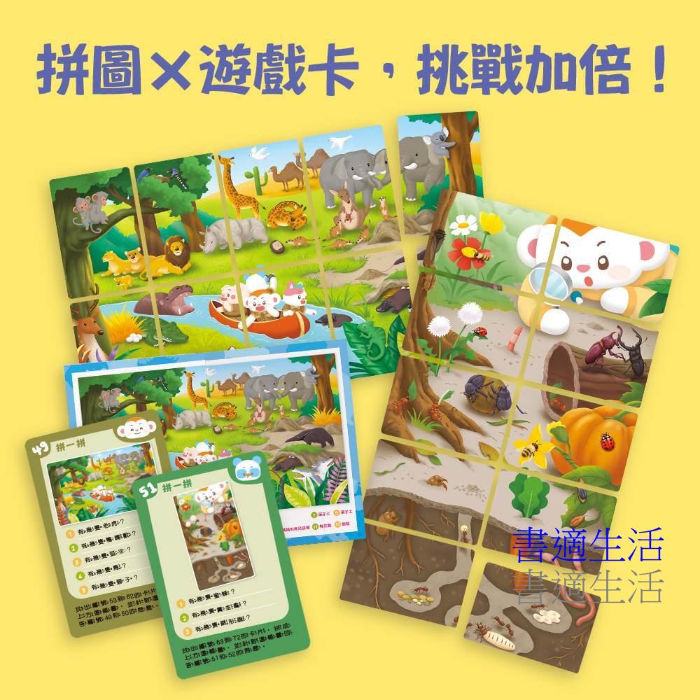 遊戲卡採用雙面設計,除了益智關卡,其中更包含10張/20面具備拼圖功能的卡片。孩子能運用這些卡片,分別拼組出「動物世界」與「昆蟲王國」兩幅大型主題場景,享受從觀察細節到空間整合的樂趣。