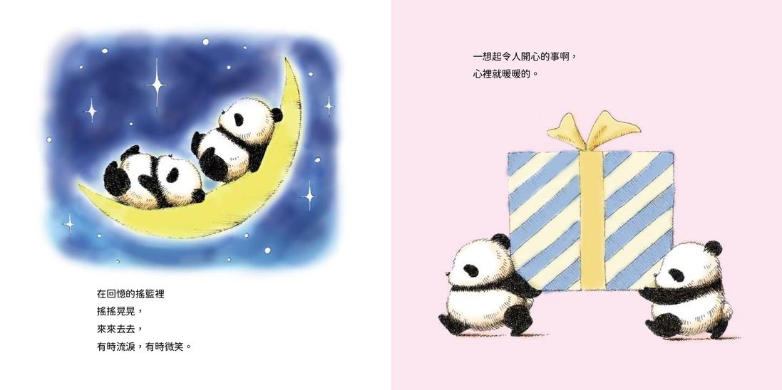 為對方撐傘的貓熊、被鳥抓走的貓熊、坐在頂看星星的貓熊……他們在想著什麼呢?雙胞胎貓熊看似調皮又淘氣的小動作,攜手克服重重困難,幽默並療癒人心的圖像,帶來滿滿能量與希望。擺脫日常的焦躁不安,重新找回前進的勇氣。