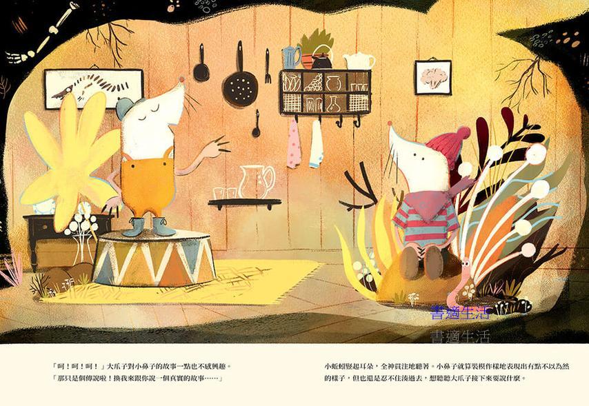 其實長者老鼠天天都到上面去,他知道上面是亮的也是暗的。白天時,太陽出來了,上面就是亮的;夜晚時,月亮和星星出來了,就是黑暗中閃著點點光芒。認真說來,小鼻子和大爪子都是對的,但也只對了一半,他們並沒有看到世界的全貌。想要真正看清上面的樣子,必須有勇氣張開眼睛。這些小鼴鼠們也許會花上更長的時間才能有睜開眼睛的勇氣,但他們終究會到地面上親眼看看外面到底有什麼在等著他們的。這就好像我們每個人的成長一樣,總要在懵懵懂懂中自以為是的跌跌撞撞,然後,有一天夠成熟了,才會恍然大悟原來以前的自己欠缺的是什麼……