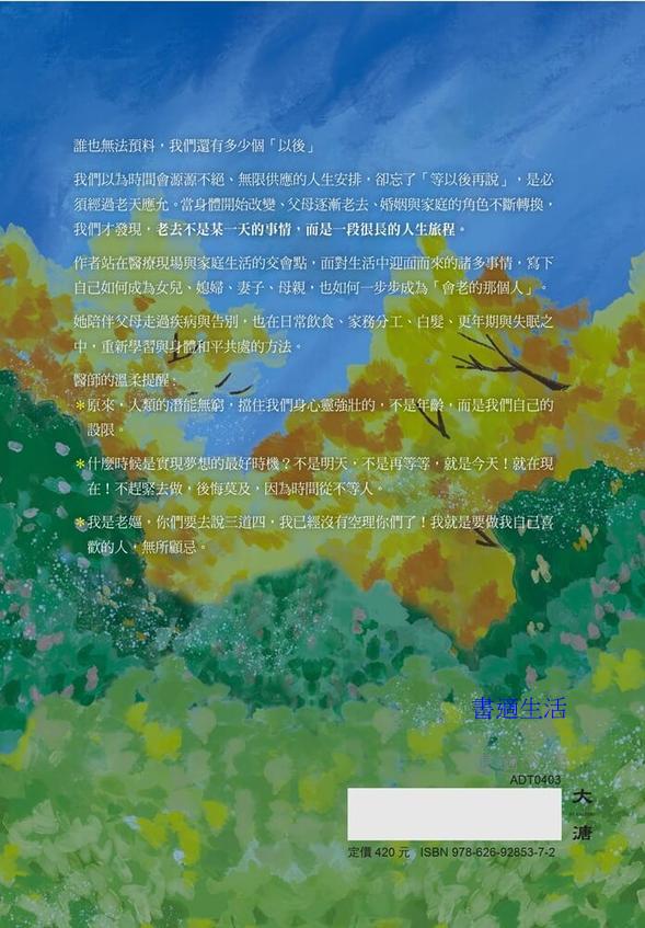 作者站在醫療現場與家庭生活的交會點,面對生活中迎面而來的諸多事情,寫下自己如何成為女兒、媳婦、妻子、母親,也如何一步步成為「會老的那個人」。