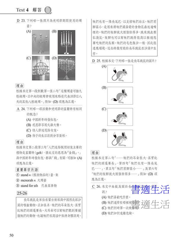 •聽力測驗:包含辨識句意、基本問答、言談理解三大題型,全面模擬考場音感。