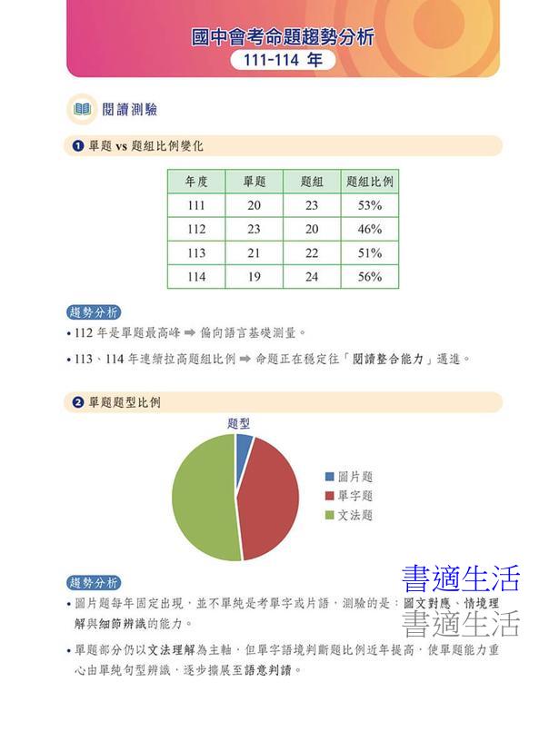 歸納歷年會考試題,掌握高頻必考主題、命題趨勢與關鍵文法,建構清楚的命題輪廓,協 助學生聚焦重點,提升整體備考效能。