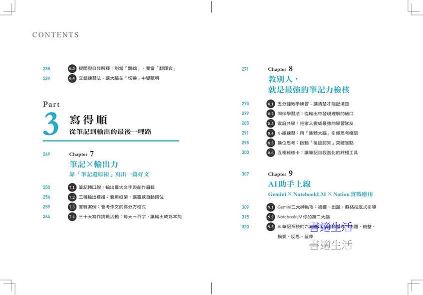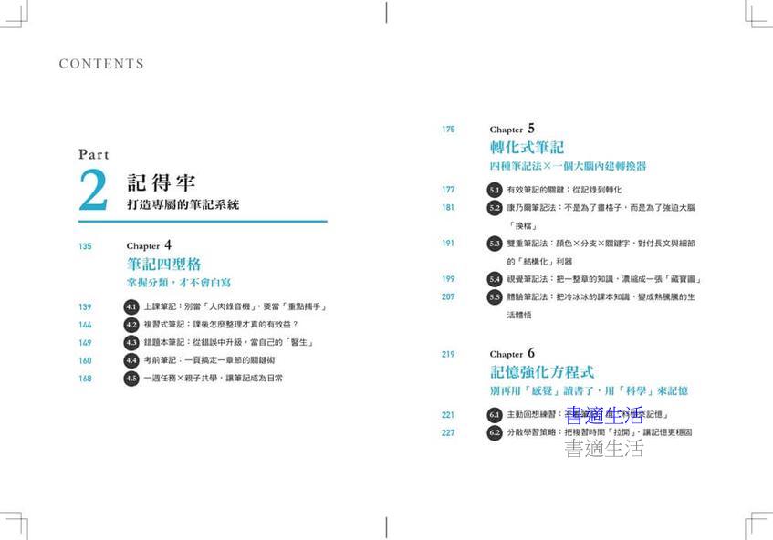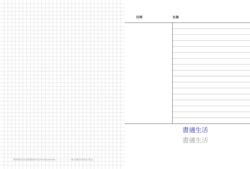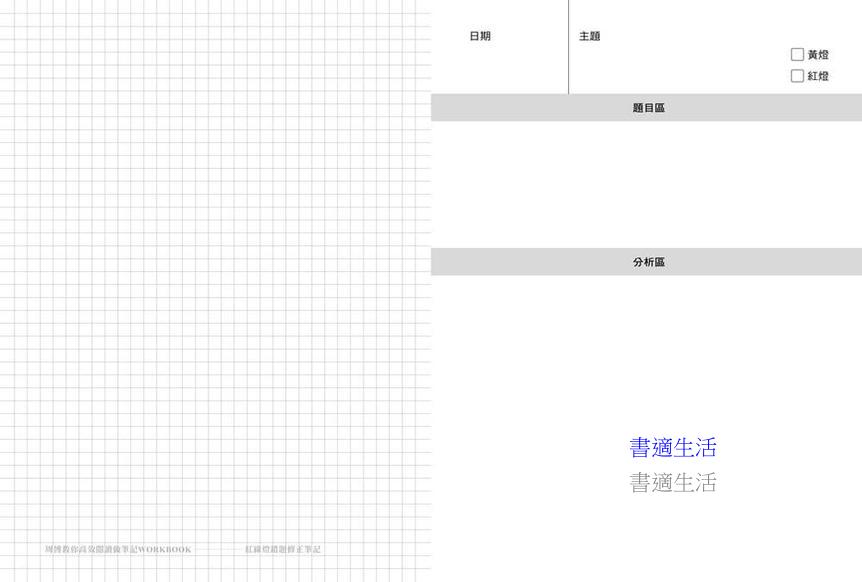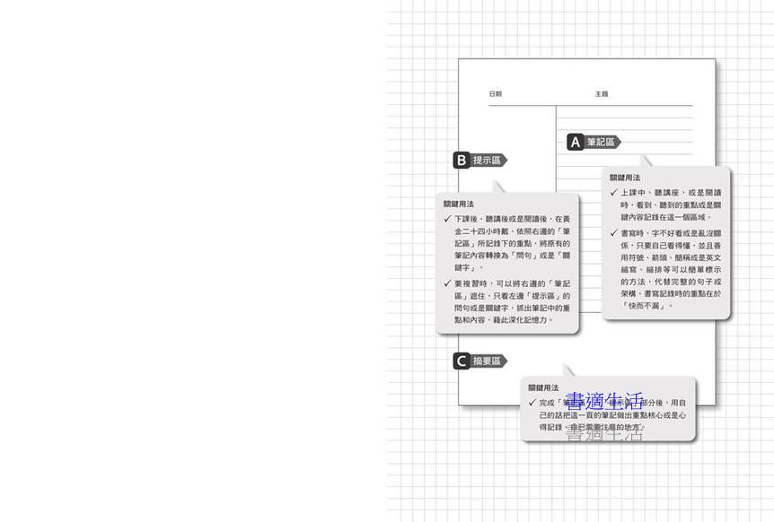 ✓ 要複習時,可以將右邊的「筆記區」遮住,只看左邊「提示區」的問句或是關鍵字,抓出筆記中的重點和內容,藉此深化記憶力。