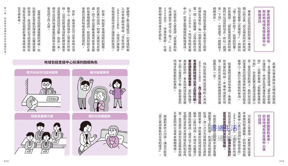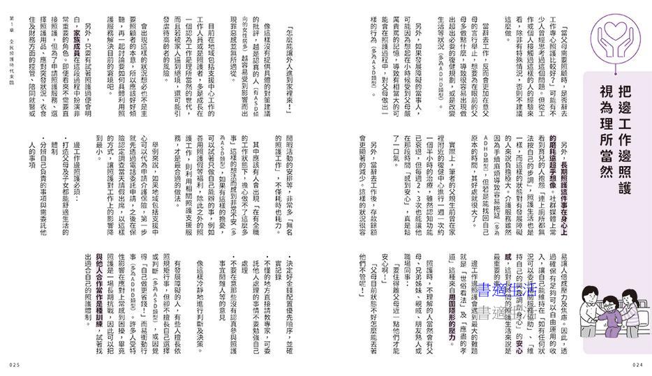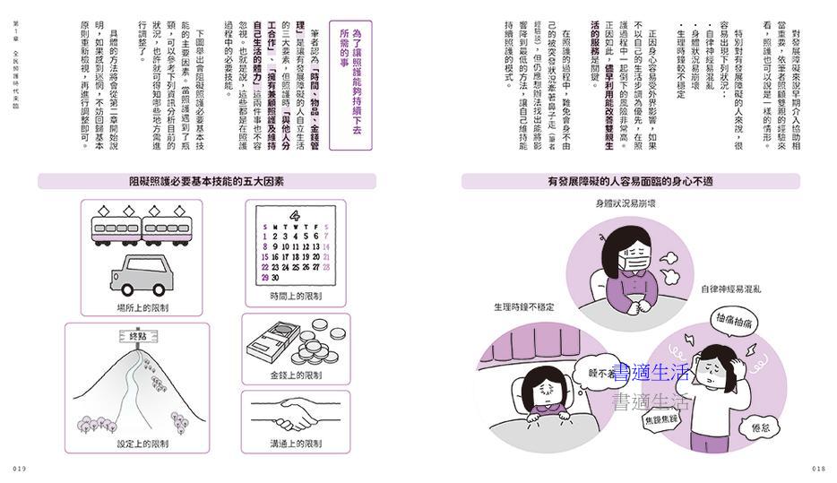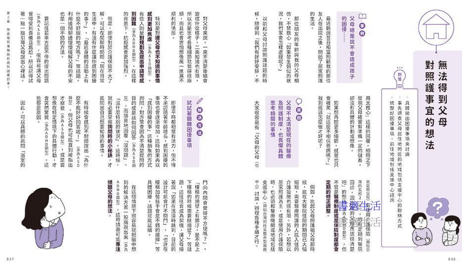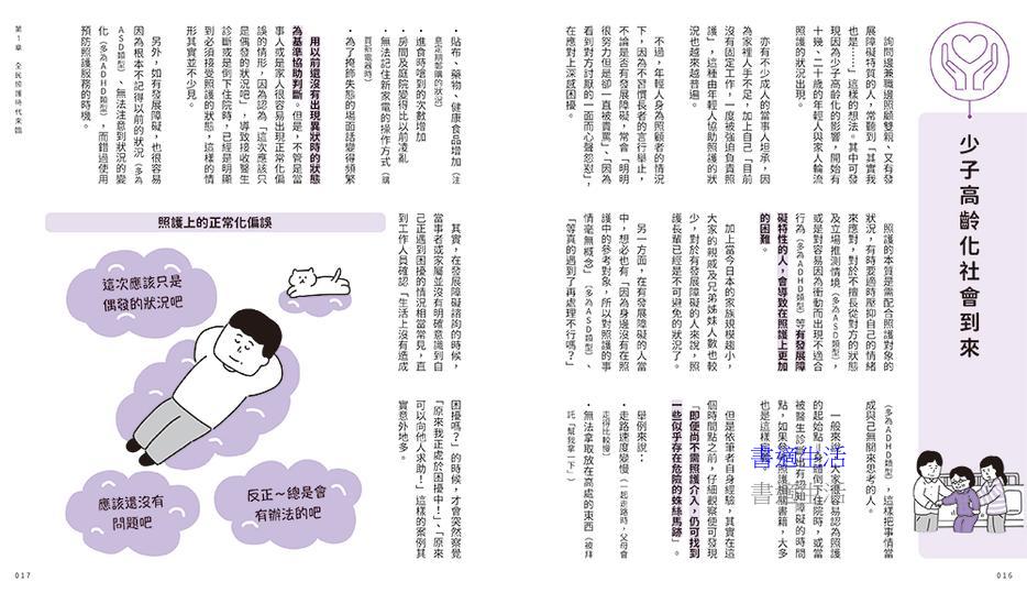或許有些人會覺得照護生活還很遙遠,但是其實像是家人間的照料、外出時的陪伴等,都算是照護的一環,並不是要等到長輩真的倒下住院後才開始。尤其對有發展障礙的當事人可能會想,光照顧自己都自顧不暇,還要照護雙親根本是難上加難。但即便有發展障礙,只要用對方法,其實有很多困難都可迎刃而解。當問題發生時,如果能意識到「啊!這本書裡有提到這樣的狀況」就能冷靜下來,也更容易做出適當的判斷決策。