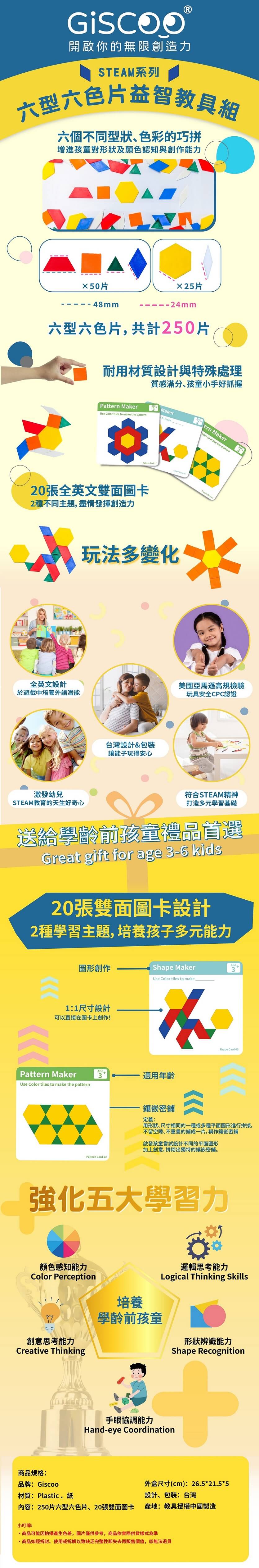 ????六個不同型狀、色彩的巧拼,玩法簡單,增進孩童對形狀及顏色認知與創作能力
